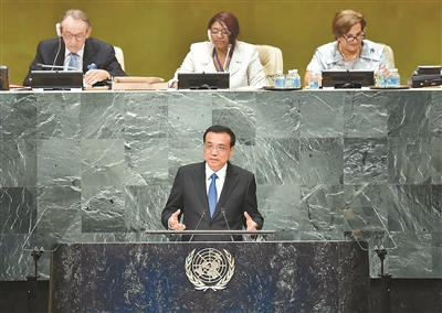 2016年9月21日,李克強同志在紐約聯合國總部出席第71屆聯合國大會以“可持續發展目標:共同努力改造我們的世界”為主題的一般性辯論并發表題為《攜手建設和平穩定可持續發展的世界》的講話。 新華社記者 李濤 攝