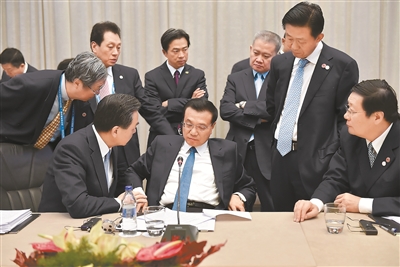 2014年12月16日,李克強同志在貝爾格萊德出席第三次中國-中東歐國家領導人會晤。這是會談間隙,他與隨行部長進行會商。 新華社發