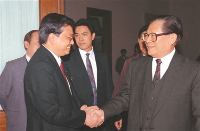 1993年5月3日下午,中國共產主義青年團第十三次全國代表大會在北京人民大會堂開幕。在5月3日上午的預備會議后,舉行第一次主席團會議,推選李克強等同志為主席團常務主席。這是江澤民同志與李克強同志握手。 新華社記者 郭占英 攝