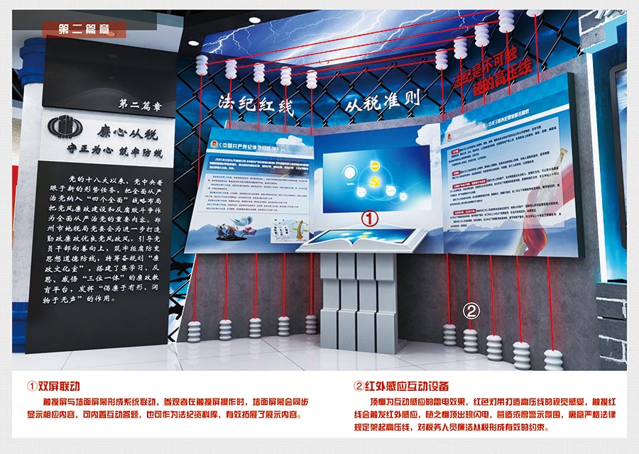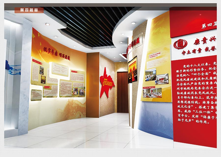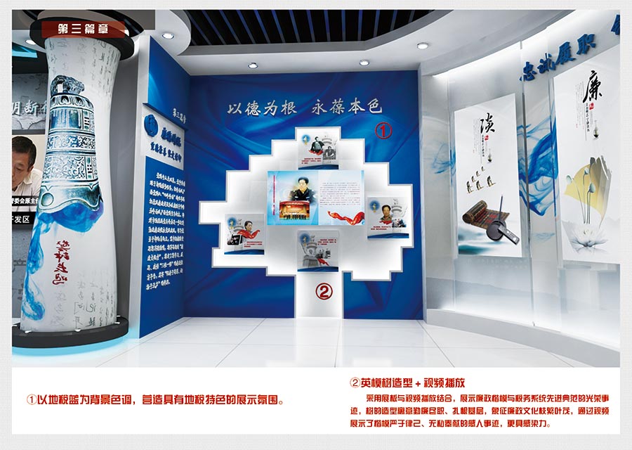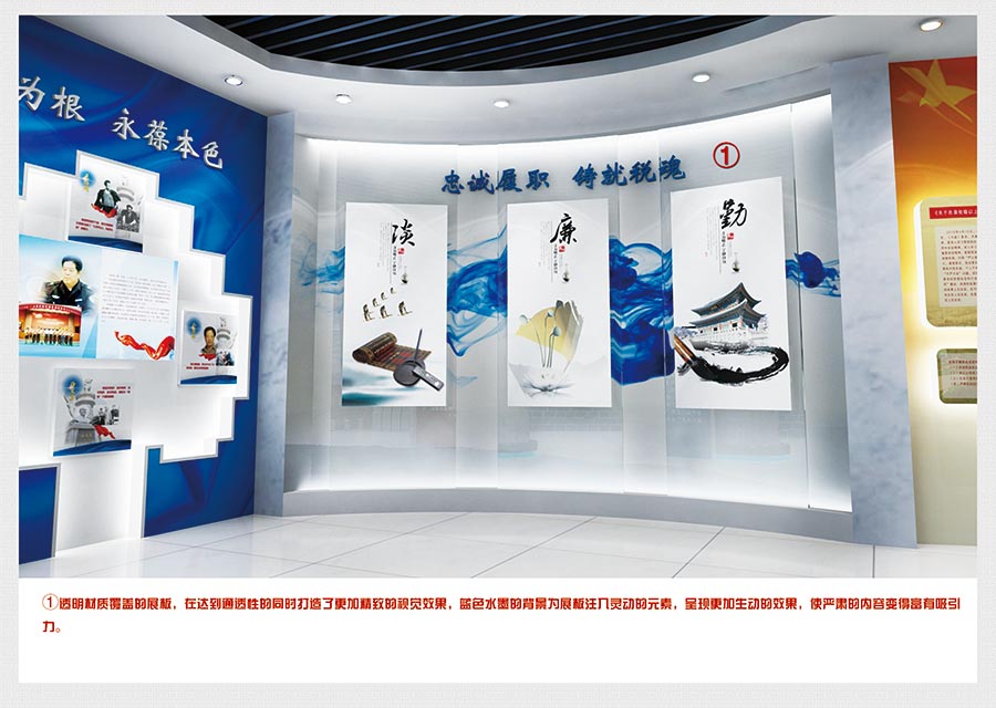 所展示的內(nèi)容立足手稅務工作實院,注重廉政教育的針勸性和實效性,包含了黨員工部的作風修養(yǎng)、稅務人員的從業(yè)要求、廉政文化的建設成果等。后期效果在設計上會配合文字方案,因地制自體現(xiàn)地方猜色,版面背景設計選用當?shù)靥厣兀_到廉政文化主題與當?shù)貐^(qū)域發(fā)展特色相融合的效果。